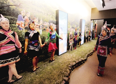 3月25日,中国畲族博物馆在浙江景宁畲族自治县鹤溪河畔开馆。中国畲族博物馆位于浙江景宁畲族自治县鹤溪河畔,占地26500平方米,收藏了1800余件畲族服饰、生产生活用具、文献、祭祀道具等,以畲族的发展变迁为主线,向人们讲述畲族的发展史和畲族的灿烂文化。 新华社记者 王小川摄