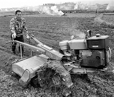 贵州省遵义市余庆县龙家镇光辉村农民袁志荣在耕作生产中。在余庆县,像这样的耕田机就有3500余台活跃在田间地头。 贺春雨摄
