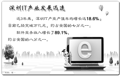 本报深圳3月26日电 记者杨阳腾报道:深圳市市长许勤在昨日召开的2012中国(深圳)IT领袖峰会上表示,近3年来,深圳的IT产业产值年均增长18.6%,目前已经突破1万亿元,约占全国的七分之一;软件业务收入增长了89.1%,约占全国的八分之一;培育了一批以华为、中兴、腾讯为代表的具有世界竞争力的IT企业。