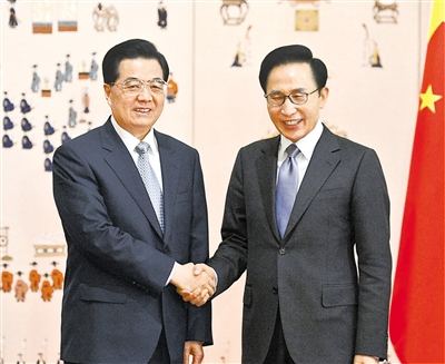 本报首尔3月26日电 记者顾金俊 马雪梅 杨明报道:国家主席胡锦涛26日在首尔会见了韩国总统李明博。两国元首就中韩关系及共同关心的国际和地区问题深入交换意见,一致同意以建交20周年和举办中韩友好交流年为契机,推动中韩关系不断取得新的发展。