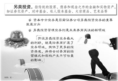 宏源证券研究所所长助理黄立军也表达了相同的观点。他认为,券商另类投资业务可以尝试与房地产业、艺术品投资等“打包”经营,券商既可以自己设立子公司单独经营这些项目,也可以出资和实体企业联合起来做,“比如投资红酒,证券公司可以尝试和酒庄联合,出一部分资金,具体经营则由酒庄来完成。”