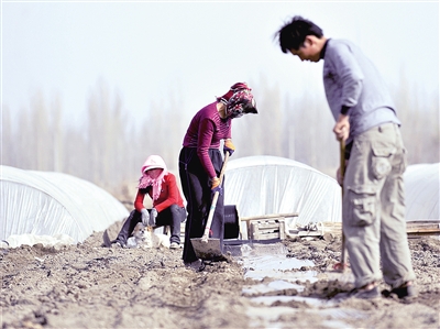 新疆巴音郭楞蒙古自治州博湖县本布图镇农民张先平一家在地里铺地膜。他家采用设施农业种植番茄比传统种植方式早2个月收获(3月31日摄)。近日,随着天气逐渐转暖,新疆各地培育的大棚蔬菜幼苗逐渐进入移栽期。 新华社记者 江文耀摄