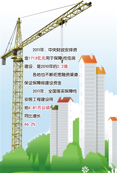 资金和土地是保障房建设的重要前提。2011年,中央财政安排资金1713亿元用于保障性住房建设,是2010年的2.2倍。各地也不断拓宽融资渠道,千方百计保证保障房建设资金。2011年,全国落实保障性安居工程建设用地4.81万公顷,同比增长46.2%,保障房建设用地实现了应保尽保。