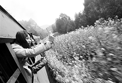 油菜花是春天的主角。在小火车上的游客被沿途的景色吸引,纷纷探出头拍照。 新华社记者 江宏景摄