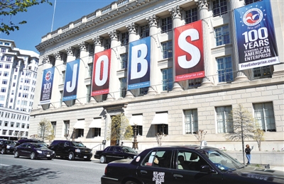 4月6日,在美国首都华盛顿,美国商会大楼前挂出“工作”字样横幅。美国劳工部当日公布的数据显示,今年3月份美国非农业部门失业率较前月下降0.1个百分点,降至8.2%,显示出美国就业市场逐渐改善的趋势,但非农业部门新增就业岗位低于此前市场普遍预期。 新华社发