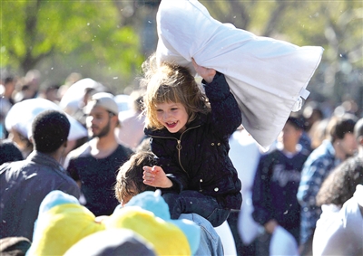 4月7日,人们在美国纽约华盛顿广场进行“枕头大战”。当天,欧洲及美国多个城市上演了一年一度的“枕头大战”。这一活动的目的在于让都市里的人们不要每天坐在电视机或者电脑前,而是到城市中心与其他人接触。如今,“枕头大战”已经成为都市人缓解紧张生活节奏和释放压力的一种有趣发泄方式。 新华社发
