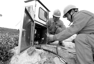 4月9日,安吉县供电局工作人员在溪龙乡黄杜村为茶农增设临时用电线路,保证茶农用电。 浙江省安吉县是著名的“白茶之乡”,春季是安吉白茶采摘、炒制的旺季。安吉县供电局工作人员通过增设“子母变”、“新增布点,缩小供电变径”等方式,确保春茶采摘季节茶农用电无忧。 新华社记者 徐 昱摄