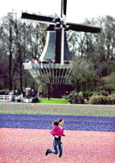 4月8日,一个孩子在荷兰西部小镇丽瑟附近的郁金香花田里奔跑。近日,荷兰迎来了郁金香盛开的时节。在西部小镇丽瑟附近的郁金香花田里,成垄的郁金香陆续绽放,构成一幅幅五颜六色的春日美图。 新华社发
