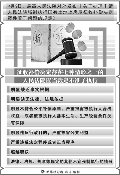 本报北京4月9日讯 记者李盛丹歌报道:为依法正确办理市、县级人民政府申请人民法院强制执行国有土地上房屋征收补偿决定(以下称征收补偿决定)案件,维护公共利益,保障被征收房屋所有权人的合法权益,最高人民法院9日对外发布《关于办理申请人民法院强制执行国有土地上房屋征收补偿决定案件若干问题的规定》。这个总共11条的司法解释,自2012年4月10日起施行。