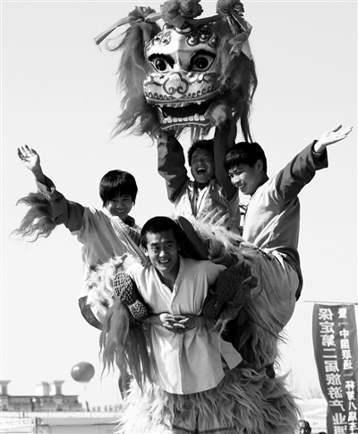 2012保定市第二届旅游产业博览会日前举办。本次旅游产业博览会有数百家景区、旅行社、星级酒店和旅游商品生产企业参加,辐射范围广、内容丰富、精彩纷呈。图为河北保定徐水县农民正在上演舞狮。 本报记者 李景录摄