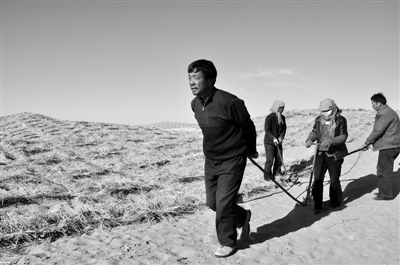 左图 在民勤青土湖沙区,当地群众在打草方格治沙。