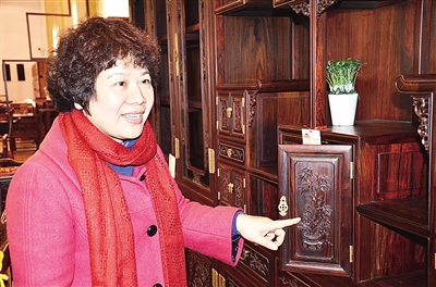 右下:华闽古典家具有限公司总经理翁美玉对产品的原材特质、工艺特点如数家珍。