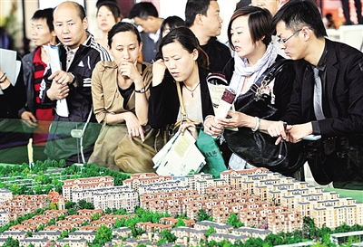 4月12日,一些市民在昆明春季房交会上观看一个新建小区的楼盘模型。当日,2012年昆明春季房交会开幕。房交会开展以来,看的人多买的人少、消费者仍在观望。 新华社记者 蔺以光摄