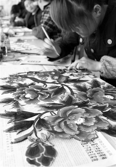4月12日,在河北省蔚县南张庄,工人正在制作剪纸。 蔚县剪纸是一种以阴刻为主、阳刻为辅的点彩剪纸,是国家级非物质文化遗产。近年来,河北蔚县在传承和保护剪纸艺术的同时,积极扶持剪纸产业化发展。目前该县剪纸专业户达1100多户,从业人员3万多人,全年生产剪纸500多万套,年产值2亿多元,使得剪纸这一“小产品”成为重要的富民产业。 新华社记者 巩志宏摄