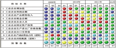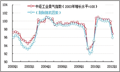 中经工业景气指数报告显示,2012年一季度,中经工业景气指数为96.9点(2003年增长水平=100),比去年四季度回落3.0点,回落幅度相对较大;中经工业预警指数为86.7点,比去年四季度回落13.3点,继续在“绿灯区”运行。