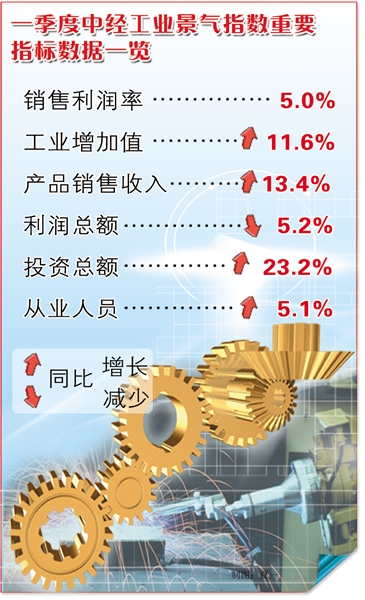 在构成中经工业景气指数的6个指标(仅剔除季节因素,保留随机因素③)中,企业利润与去年同期相比由增长转为下降,销售、税金、出口、就业的同比增长与去年四季度相比均明显回落,投资增长则温和放缓。