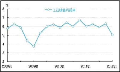 经初步季节调整,一季度,工业企业利润总额由2011年的同比较快增长(增幅为25.4%)转为同比减少5.2%;一季度工业企业销售利润率为5.0%,较去年四季度下降1.3个百分点,低于2010年以来的平均水平;一季度工业企业亏损面达20.4%,高于2010年以来的平均水平。