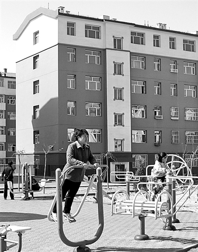 左图 4月16日,内蒙古乌海市的市民在新建成的保障房小区内锻炼身体。