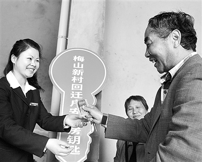 安徽省合肥市蜀山区梅山新村回迁户开始逐步迁入在原址新建的回迁安置房内。694户回迁居民全部住上宽敞明亮的新房子。图为回迁居民张先生(右)选房后领取自家新居的钥匙。 新华社记者 郭 晨摄