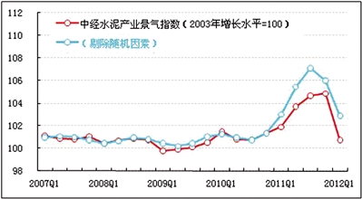 2012年一季度,中经水泥产业景气指数为100.7点,较上季度下降4.1点。中经水泥产业预警指数为90.0点,较上季度下降23.3点,在“绿灯”区间偏冷区域运行。与上季度相比,水泥产业应收账款同比增速加快;水泥产量、销售收入、固定资产投资总额、从业人员数、利润合成指数、税金总额和产成品资金占用同比增速均有所放缓;水泥产业生产者出厂价格水平下降。