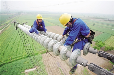 4月18日,在安徽省安庆市枞阳县境内,安徽送变电工程公司施工人员在安徽安庆500千伏文都变电站至铜陵500千伏官山变电站输电线路开展检修作业。线路技改完成后,将大大提高“皖电东送”西通道运行的安全稳定性。 郑贤列摄 (新华社发)