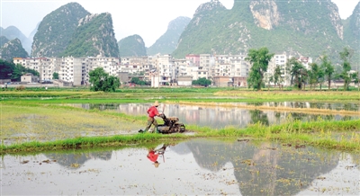 4月19日,在广西贺州市八步区一片农田里,一位农民正在操作机械翻耕稻田。连日来,广西各地出现不同程度降雨,广大农民抓住雨水充沛的大好时机抢耕抢播,田间地头处处是繁忙的农耕景象。 新华社记者 陆波岸摄