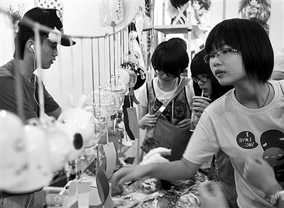 4月14日,为期3天的“2012海口动漫游戏嘉年华”在海口市会展中心开幕。活动吸引了上万名动漫爱好者前来参观。图为动漫爱好者在选购动漫游戏衍生产品。 郭 程摄(新华社发)