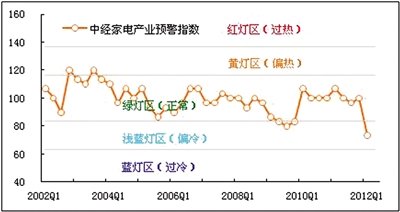 一季度,中经家电产业景气指数为96.7点,较上季度回落1.6点,已连续7个季度呈回落态势,本季度回落幅度有所扩大。构成家电产业景气指数的多项指标同比增速均呈不同程度的回落趋势,短期走势不容乐观。一季度家电产业预警指数为73.3点,较上季度下降26.7点,基本处于历史低位,目前已进入偏冷的“浅蓝灯”区运行。