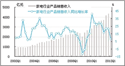①家电行业包括家用视听设备制造业和家用电力器具制造业两个行业;统计范围分别是规模以上工业企业近1000家和近3000家。2011年工业统计口径由年销售收入500万元以上工业企业扩大为年销售收入2000万元以上工业企业。