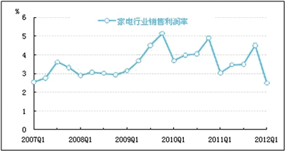 一季度家电行业销售利润率为2.5%,较上季度大幅下降2.0个百分点,低于本季度全部工业5.0%的平均水平。目前家电行业销售利润率为2006年三季度以来的最低水平,相比2008年3.0%平均的水平还要低0.5个百分点。近年家电行业销售利润率在一季度均出现明显的回落,二、三、四季度逐季回升,但在目前家电行业需求不足,劳动力成本上升等因素的影响下,行业盈利水平难以出现明显回升。