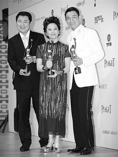 4月15日,获得最佳电影奖的《桃姐》剧组代表在记者见面会上亮相。当晚,第31届香港电影金像奖颁奖典礼在香港文化中心举行。 新华社发