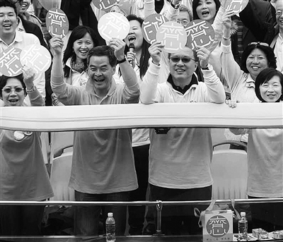 3月25日,57岁的梁振英获得689张有效票,当选为香港特区第四任行政长官人选。图为梁振英(前排左二)在竞选活动中。 郭 辑供图