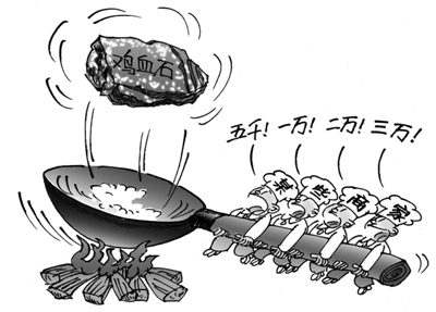 第十六届“西洽会”上,陕西省旬阳县出产的一块4公斤重的鸡血石卖出了11万元的高价。 从2011年5月起,旬阳鸡血石的身价一路攀升,品质较好的鸡血石价格更是涨到以前的10倍。专家认为,目前旬阳鸡血石的高价,包含很多炒作的“水分”。鸡血石已经过分商品化,收藏市场也不够规范,才造成价格涨势过快现象的出现。 蒋跃新作 新华社发