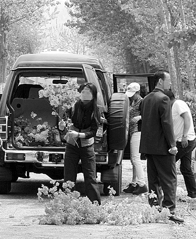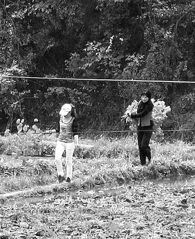 左下图:游客在把采摘的映山红花枝放进汽车内