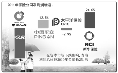 中国人寿、中国平安、中国太保、新华保险2011年净利润增速分别为-45.5%、12.5%、-2.9%和24%。孙婷表示,受资本市场下跌影响,寿险利润总体较2010年负增长35.6%,产险公司盈利水平普遍维持稳定。若考虑分红、融资及评估利率调整等因素,中国人寿、中国平安、中国太保和新华保险2011年末的净资产分别同比增长-1.2%、5.3%、-0.7%及-9.1%,除中国平安外,其他公司净资产均负增长。