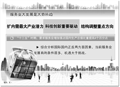记者:国际金融危机以来,无论是从国际产业变革趋势来看,还是从我国转变发展方式的迫切需要来说,促进服务业大发展都是大势所趋。而且中国制造业升级、庞大的内需市场都需要服务业强有力的支撑,这也会转化为有利于服务业发展的巨大市场潜力。