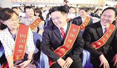 4月29日,四川剑阁县的劳动模范和优秀工作者欢聚一堂,景萍(左)、陈永红(中)和郭兴利因在各自领域的突出成绩受到表彰。