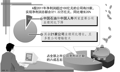 数据显示,A股去年净利润超过100亿元的公司有23家,除中国石油和中国人寿两家蓝筹公司业绩同比下降,其余21家公司业绩同比增长,且多数公司增幅较大。这23家公司去年实现净利润总额合计1.22万亿元,同比增长20%,占全部上市公司净利润总额的六成左右。蓝筹股投资价值凸显,成为2011年年报的一个亮点。