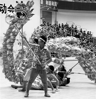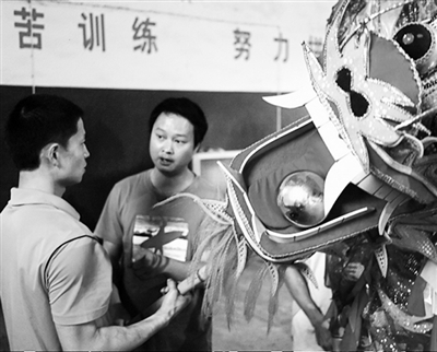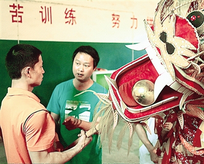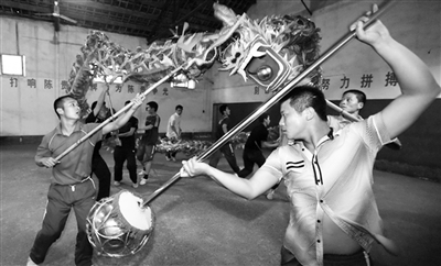 32岁的郭松林和另外两名队友是2000年组队时的老队员,现在他已经成为这支龙狮队的教练(上图)。4月25日,第七届农运会秧歌预赛在黄石市举行,陈贵镇龙狮队应邀前往表演助兴(中图)。 刘 刚摄影报道