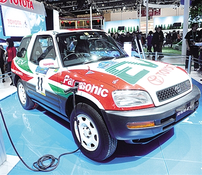 第十二届北京国际汽车展上,观众在丰田展台观看一款外插充电式越野车。 本报记者 赵 晶摄