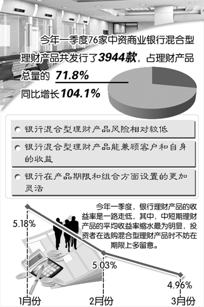 银率网最近发布的一季度理财产品市场报告显示,76家中资商业银行理财产品发行总量为5493款,同比增长12.7%。其中,混合型理财产品共发行了3944款,占理财产品总量的71.8%,同比增长104.1%。
