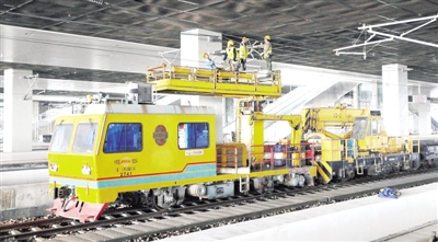5月5日,工程人员在对郑州新东站的电线进行调试。近日,国家重点工程、全国最大的综合性交通枢纽之一——郑州新东站正在抓紧进行主体建筑最后的装修、安装及调试工作。 新华社记者 李 博摄