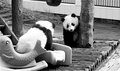 为了感谢佳能(中国)所做的贡献,四川省野生动物保护协会决定挑选两只熊猫作为“形象友谊大使”,给它们分别起名为“佳佳”和“能能”,同时回赠送了一本记录着它们出生以来的影像资料。记者在保护区的熊猫幼儿园见到了这两只不到一岁的大熊猫,它们在园内工作人员的悉心照顾下,健康地成长。