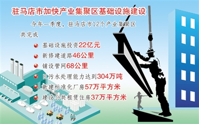 驻马店市抓住中原经济区建设和承接产业转移的机遇,把产业集聚区建设作为全市经济又好又快发展的后劲所在,按照“做大总量、提升层次、集群发展、打造亮点、搞好服务”的总体要求,采取增加集聚区空间规模、调整集聚区空间布局,优化资源配置的做法,把加快产业集聚区基础设施作为工作重点,加大投入,加快推进。今年一季度,全市12个产业集聚区共完成基础设施投资22亿元,新修建道路46公里,铺设管网68公里,日污水处理能力达到304万吨,新建标准化厂房57万平方米,建设公共租赁住房37万平方米。驻马店市建立了正阳县花生、平舆县皮革、泌阳天然石材、汝南蔬菜、王守义十三香等5个省级质检中心,遂平县、西平县、上蔡县等5个产业集聚区建立了食品安全检验检测中心。