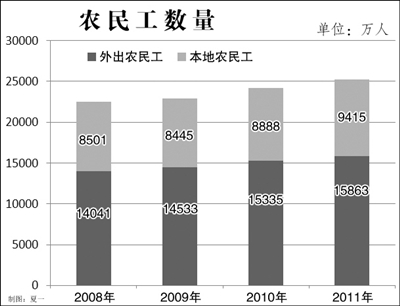国家统计局日前发布的《2011年我国农民工调查监测报告》显示,2011年,我国农民工总量超过2.5亿人,省内务工人数首次超过跨省外出人数,中西部对农民工的吸纳能力增强;40岁以上农民工所占比重逐年上升,农民工“无限供给”状况改变;收入同比增长超两成,东中西部收入差距缩小;居住和权益保障情况继续改善,但超时劳动、社会保障总体水平较低等形势依然不容乐观。