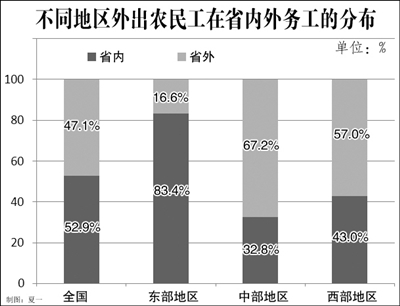 此外,2011年,省内务工人数首超跨省外出务工人数。在外出农民工中,在省内务工的农民工8390万人,占外出农民工总量的52.9%;在省外务工的农民工7473万人,占外出农民工总量的47.1%。在省内务工的比重比上年上升3.2个百分点。