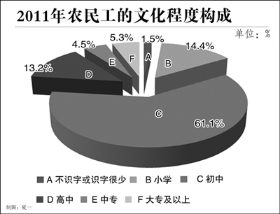 从文化程度来看,在农民工中,文盲占1.5%,小学文化程度占14.4%,初中文化程度占61.1%,高中文化程度占13.2%,中专及以上文化程度占9.8%。外出农民工和年轻农民工中初中及以上文化程度分别占88.4%和93.8%。外出农民工的受教育水平明显高于本地农民工,青年农民工的受教育水平最高,也是最具潜力的农民工群体。