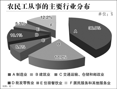 从农民工的从事行业来看,从事制造业的比重最大,占36.0%,其次是建筑业占17.7%,服务业占12.2%,批发零售业占10.1%,交通运输仓储和邮政业占6.6%,住宿餐饮业占5.3%。从近几年调查数据看,变化较明显的是建筑业,农民工从事建筑业的比重在逐年递增,从2008年的13.8%上升到17.7%,从事制造业的比重则趋于下降。