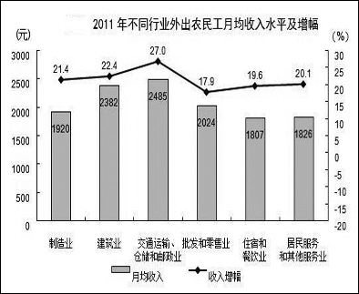从外出农民工从事的主要行业看,收入水平较高的是交通运输仓储邮政业和建筑业的农民工,月均收入分别为2485元和2382元;收入较低的分别是住宿餐饮业、服务业和制造业的农民工,月均收入分别为1807元、1826元和1920元。