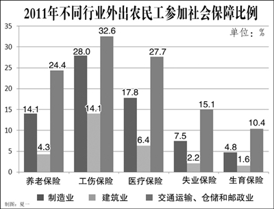 从社会保障情况看,外出农民工参加社会保险的水平有所提高,但总体仍然较低,中西部地区农民工参保比例明显低于东部地区。2011年,雇主或单位为农民工缴纳养老保险、工伤保险、医疗保险、失业保险和生育保险的比例分别为13.9%、23.6%、16.7%、8%和5.6%,除工伤保险比上年略减外,养老保险、医疗保险、失业保险和生育保险的比例分别比上年提高4.4、2.4、3.1和2.7个百分点。从输入地看,不同地区的农民工社会保障状况差异仍较大,中西部地区的农民工参保比例比较接近,落后于在东部地区务工的农民工。东部地区养老保险、医疗保险、失业保险和生育保险的比例分别比上年提高5.5、3.2、3.8和3.2个百分点。